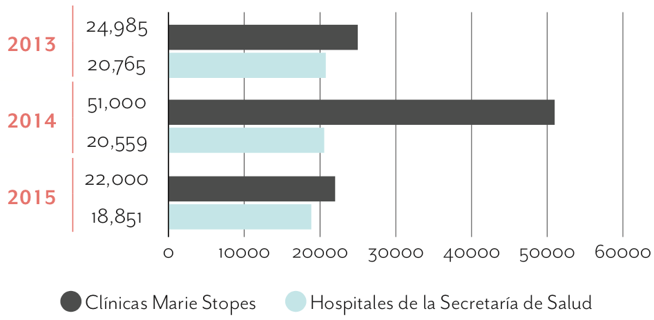 En este sentido, se ha observado que en algunos años una sola organización privada ha realizado más abortos que los que se llevan a cabo en todos los hospitales de la Secretaría de Salud de la Ciudad de México. Las clínicas Marie Stopes realizaron 24,985 abortos en 2013, 51 mil en 2014 y 22 mil en 2015, todos ellos en la Ciudad de México. Todos los hospitales juntos de la Secretaría de Salud sumaron 20,765 en 2013, 20,559 en 2014 y 18,851 en 2015 (Pérez et. al, 2017).