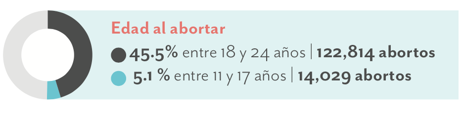 Según los datos de la Secretaría de Salud (2023), en el programa ILE, respecto al grado educativo, el 73% de las mujeres reportaron que contaban solo con el grado de secundaria o preparatoria. Asimismo, el 45.4% de las mujeres que abortaron tenían entre 18 a 24 años (122,814) y el 5.1% (14,029 abortos) fueron realizados en niñas y adolescentes de entre 11 y 17 años.